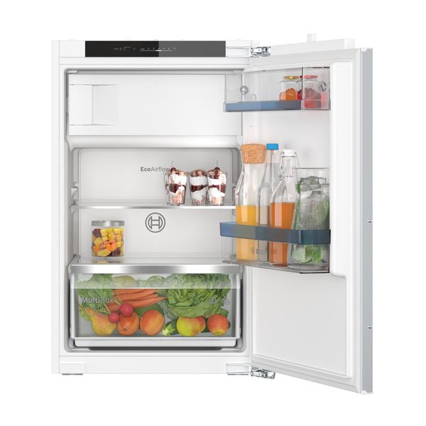 De Bosch KIL22VFE0 Serie 4 inbouwkoelkast meet 88 x 56 cm en heeft een vlakscharnier. Met een ruim ontwerp biedt het een Multi Box XXL lade voor groente en fruit, een vriesvak en SuperKoelen voor optimale voedselopslag.