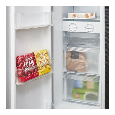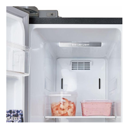 De koelkast heeft energiezuinige led-verlichting in zowel het koel- als vriesgedeelte, en de deurvakken in beide deuren bieden extra opbergruimte. Deze onderdelen zijn gemakkelijk te verwijderen voor een grondige reiniging.