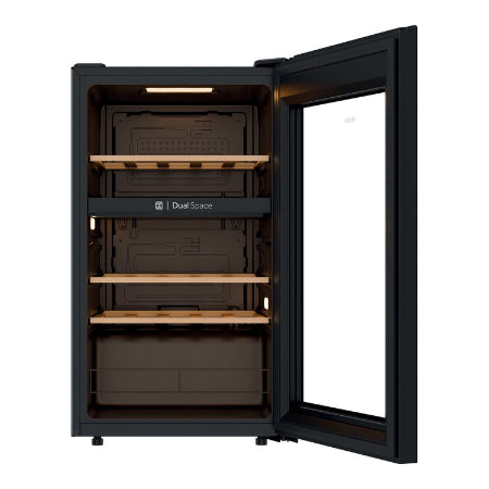 De Haier HWS32GDG is een stijlvolle wijnkoelkast met ruimte voor 32 flessen, ontworpen voor wie zijn collectie met zorg wil bewaren zonder veel ruimte in te nemen.