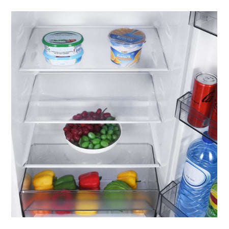 Binnenin vindt u 5 draagplateaus, een transparante groentelade en 4 deurvakken, waaronder een flessenvak en een eierrekje. Alles is eenvoudig uitneembaar, zodat schoonmaken snel en makkelijk gaat. De deur is omkeerbaar en kan zowel links als rechts worden gemonteerd.