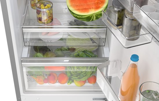 Met de extra ruime VitaFresh-lades blijven vlees, vis en groenten langer vers. De temperatuur in dit compartiment is lager dan in de rest van de koelkast, en de luchtvochtigheid wordt geoptimaliseerd voor elk type voedsel.