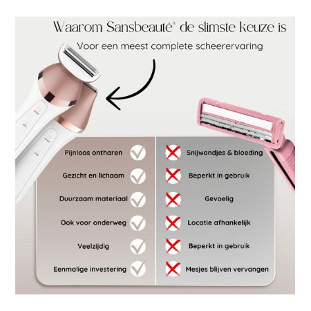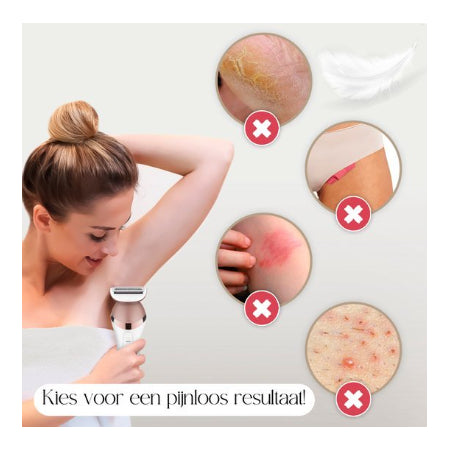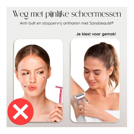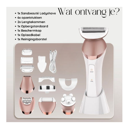 Maak kennis met de Sansbeauté® 6-in-1 Ladyshaver, de ultieme oplossing voor een gladde, verzorgde huid zonder pijn of irritatie.