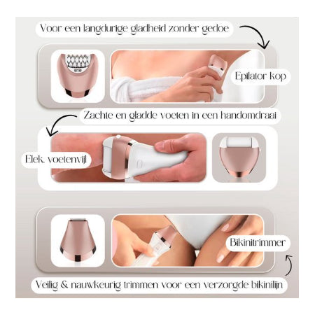 Dit veelzijdige apparaat is perfect voor gezicht, oksels, benen, bikinilijn én voetverzorging. Met zes opzetstukken combineer je scheren, epileren, trimmen, gezichtsreiniging, massage en een elektrische voetenvijl in één compact en handig apparaat.