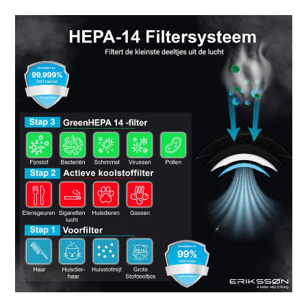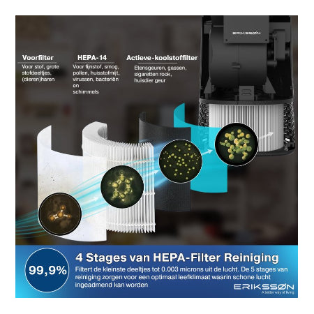 De Erikssøn Air Pure Elite is uitgerust met een vijflaags filtersysteem dat tot 99,995% van alle schadelijke deeltjes tot 0,3 µm verwijdert: