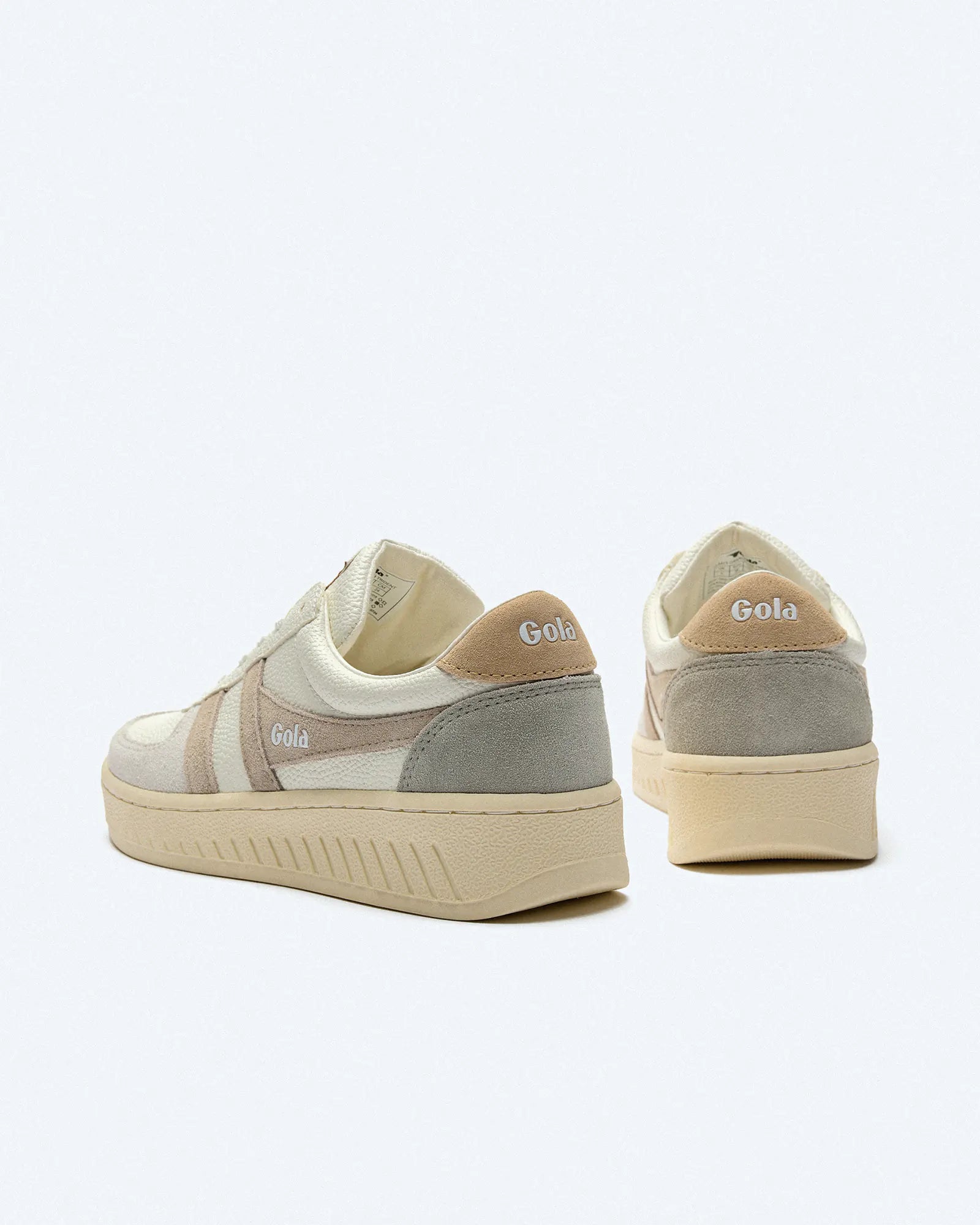 De Gola Grandslam Trident sneakers in wit, lichtgrijs en haver combineren klassieke elegantie met moderne details. De harmonieuze kleurencombinatie geeft de sneakers een ingetogen en veelzijdige uitstraling die moeiteloos bij elke outfit past.