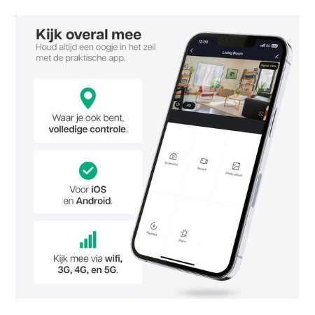 Bekijk realtime beelden via de gratis app voor iOS en Android. Ontvang meldingen, start opnames op afstand of stel schema’s in – allemaal vanaf je smartphone.
