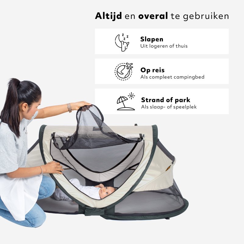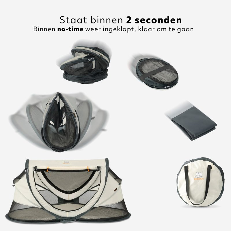 De Deryan Peuter Luxe is de perfecte vervanging van het traditionele campingbedje: lichtgewicht, compact en multifunctioneel. Dankzij het slimme pop-up systeem staat het bedje in slechts 2 seconden klaar, waardoor je meteen van je tijd met je kindje kunt genieten.