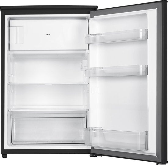Deze tafelmodel koelkast biedt 109 liter netto inhoud. Hij is uitgerust met twee glazen legplateaus, waarvan er één verstelbaar is. Het geharde glas van de planken zorgt voor extra stevigheid. Bovenin de koelkast bevindt zich een vriesvak voor het invriezen van producten.