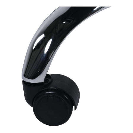 De stoel heeft verchroomde poten met wielen, wat zorgt voor mobiliteit en een stijlvolle uitstraling. Hij is stevig gebouwd en geschikt voor gebruikers tot 120 kg.