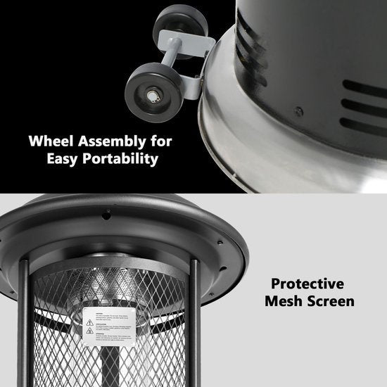 Dankzij de geïntegreerde wielen verplaats je de terrasverwarmer zonder moeite over het terras of door de tuin. De ingebouwde omvalbeveiliging garandeert een veilige werking onder alle omstandigheden.
