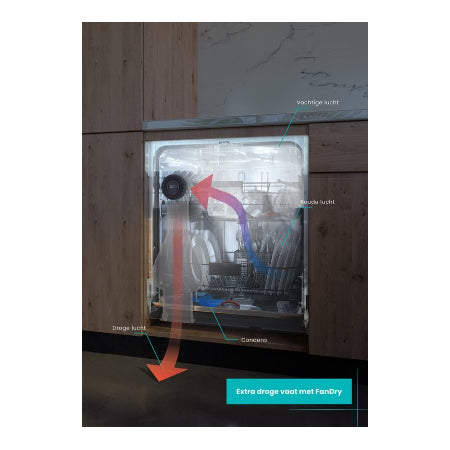 Dankzij de innovatieve FanDry-technologie is uw vaat altijd perfect droog. De ventilator in de deur voert de vochtige lucht snel af, zodat uw servies en glazen direct uitneembaar en glanzend schoon zijn.