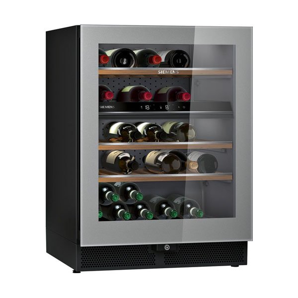 De Siemens KW16KATGB iQ500 is een vrijstaande wijnklimaatkast met premium design, biedt twee temperatuurzones (5°C tot 20°C) voor optimale wijnopslag.
