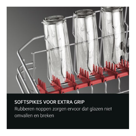 Glazen, vaak de meest fragiele items in uw vaatwasser, verdienen extra bescherming. Het bovenrek is uitgerust met rubberen noppen die de glazen ondersteunen en beschermen. De SoftSpikes zorgen ervoor dat uw glazen en mokken rechtop blijven staan, zodat ze niet omvallen of breken.