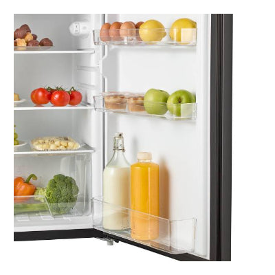De koeler beschikt over drie draagplateaus, een transparante groentelade en twee deurvakken, inclusief een flessenvak en een eierrekje.