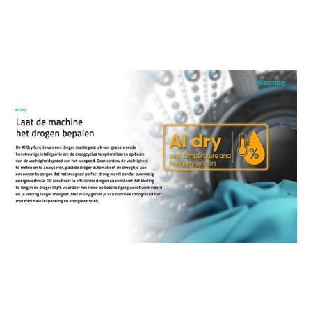 De AI Dry-functie meet continu de vochtigheidsgraad van het wasgoed en past automatisch de droogtijd aan. Zo voorkom je onnodig energieverbruik en blijft kleding beschermd.
