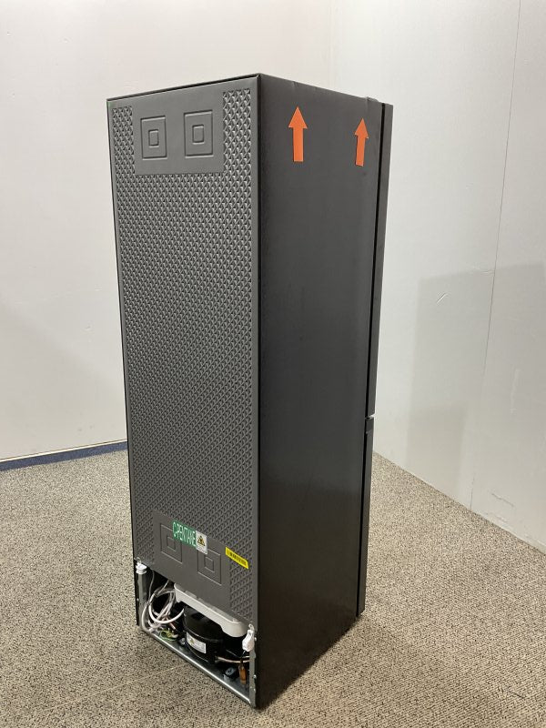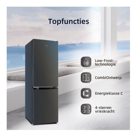 De donkere roestvrijstalen afwerking en strakke lijnen geven deze koel-vriescombinatie een luxe uitstraling. De geïntegreerde handgrepen onderstrepen het minimalistische design en zorgen voor een naadloze look.