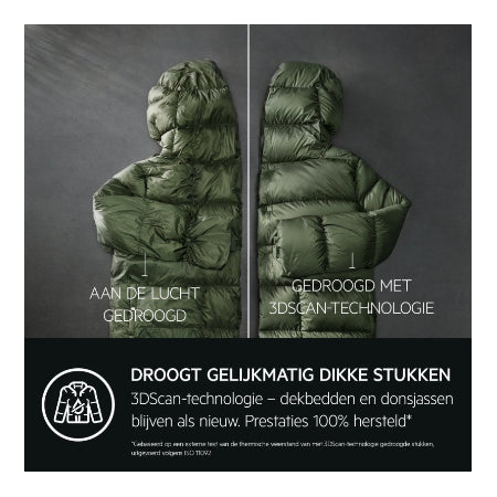 3DScan-technologie meet tot 5 cm diep in de stof en herkent precies hoeveel vocht er nog in je kleding zit. Hierdoor worden zelfs dikke items zoals dekbedden of gewatteerde jassen volledig en gelijkmatig gedroogd.