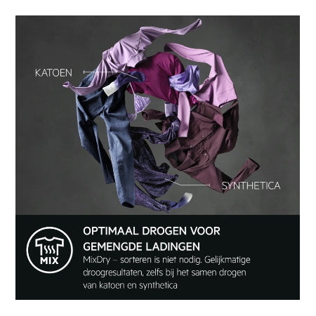 MixDry zorgt ervoor dat katoen en synthetische stoffen in hetzelfde programma perfect gelijkmatig drogen. Geen risico op te warm of te koud drogen en je hoeft niet langer te sorteren.