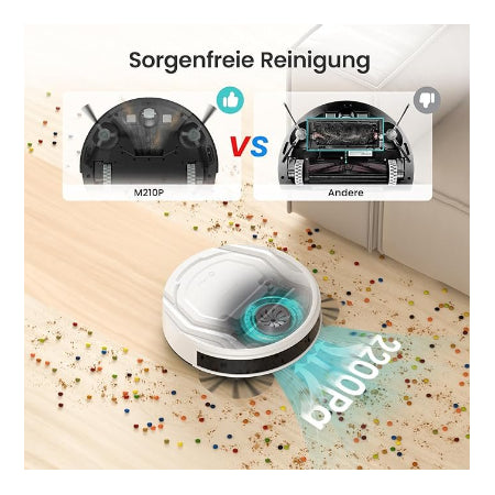 Stil en ideaal voor dierenharen: Aangedreven door een krachtige digitale motor levert de robotstofzuiger hoge zuigkracht. De borstelloze zuigstructuur maakt het mogelijk om dierenharen en vuil effectief in de stofbak te transporteren, waardoor de M210 ideaal is voor huisdiereigenaren.