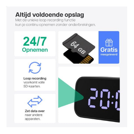 De meegeleverde 64GB SD-kaart biedt voldoende opslag. Met loop recording worden oudere opnames automatisch overschreven, zodat je 24/7 beveiliging hebt zonder onderbreking.