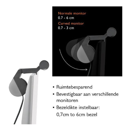 - Eenvoudige installatie: Bevestig op monitors van 0,6 tot 6 cm dik, inclusief curved monitors (1000R–1800R) met het gepatenteerde klem- en accessoiresysteem.