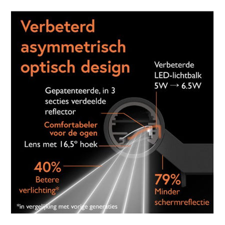 - Geen verblindend licht: Het asymmetrische optische ontwerp verlicht alleen je bureau, niet je scherm.