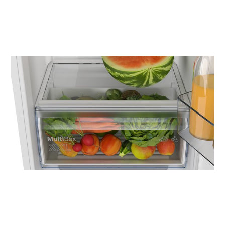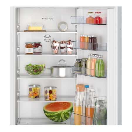 De Bosch KIR41NSE0 is een volledig geïntegreerde 1-deurs koelkast die perfect past in je keukeninterieur. Met een netto inhoud van 204 liter en een stil geluidsniveau van slechts 35 dB biedt deze koelkast een uitstekende balans tussen ruimte, comfort en efficiëntie.
