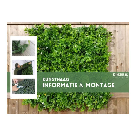 De kunsthaagmatten van 50×50 cm zijn gemakkelijk aan elkaar te klikken tot het gewenste oppervlak. Bevestigen tegen muren of hekken doe je zonder gereedschap, met bijpassend montagemateriaal of tie-wraps (verkrijgbaar via onze webshop). Wil je nog meer gemak? Selecteer ‘Ja, handig!’ bij de montage-optie en ontvang alles in één pakket.